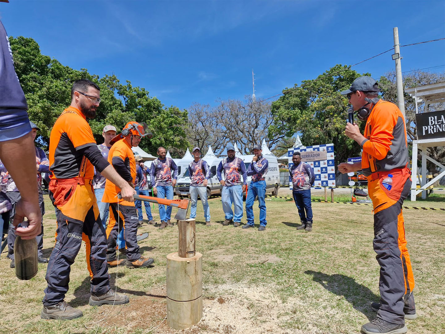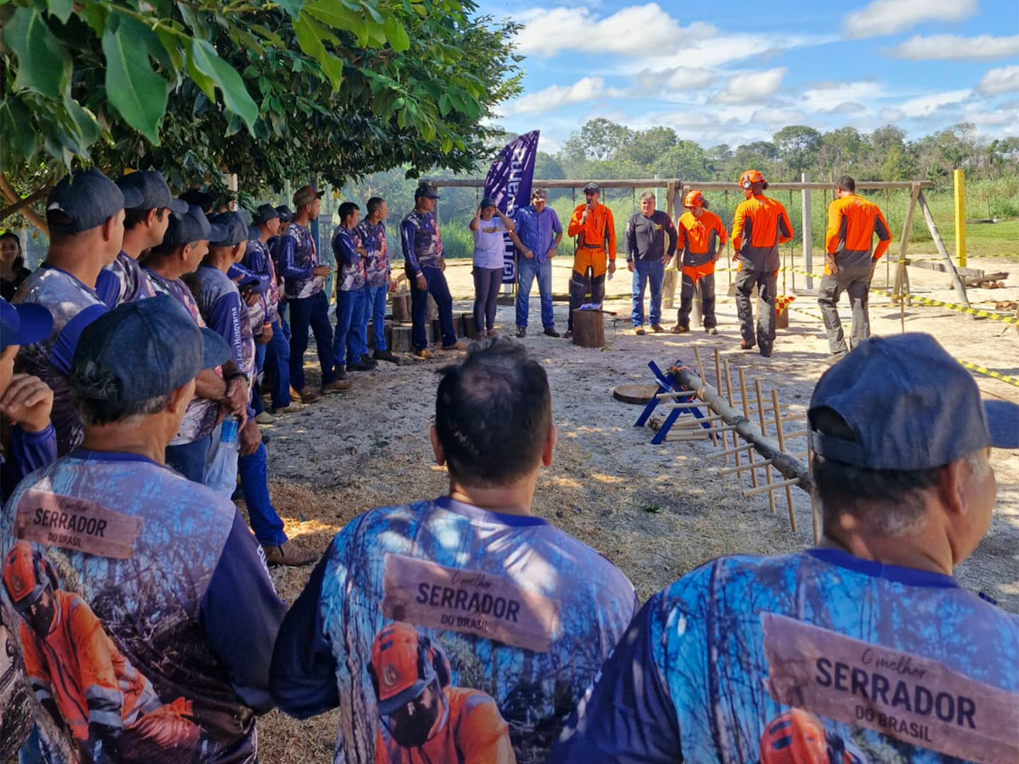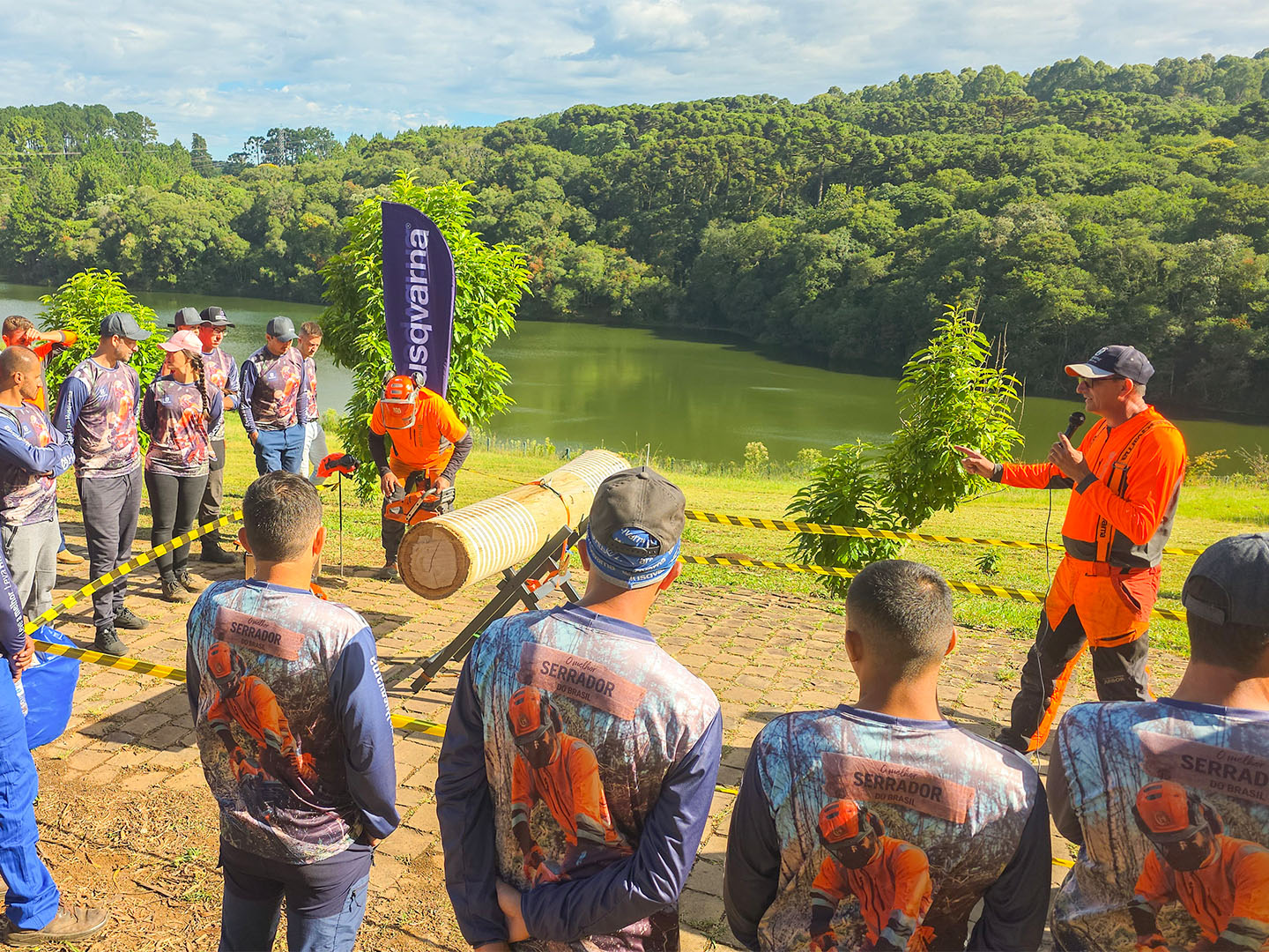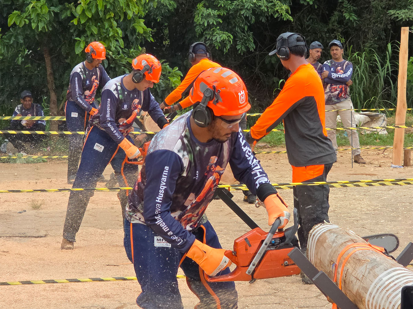 Os participantes enfrentam desafios práticos: desgalhamento, desbaste e corte de “bolachas” de madeira.